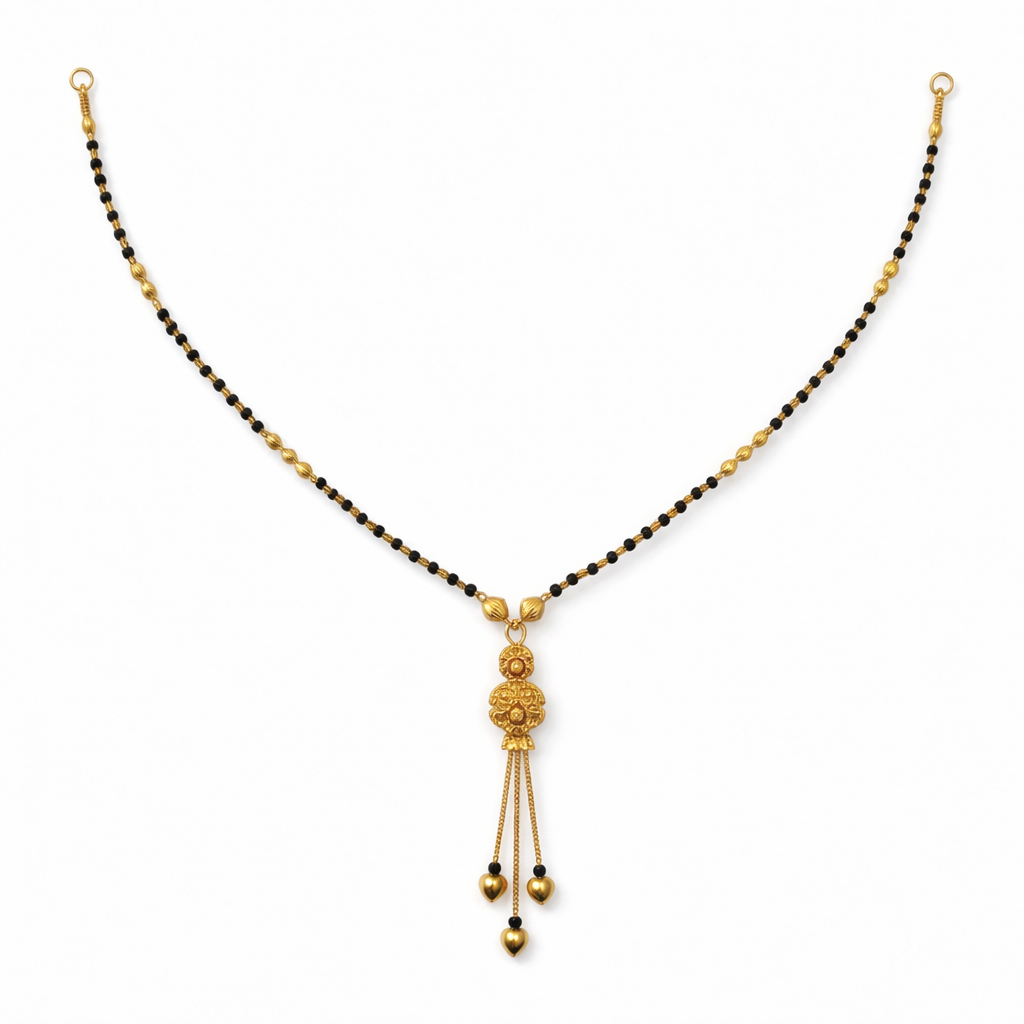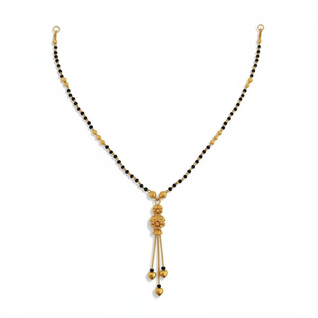 The delicate chain is adorned with finely arranged black beads, symbolizing tradition, while the central pendant showcases intricate craftsmanship with a graceful hanging design. Its lightweight structure ensures comfortable all-day wear, making it ideal for daily use as well as special occasions.